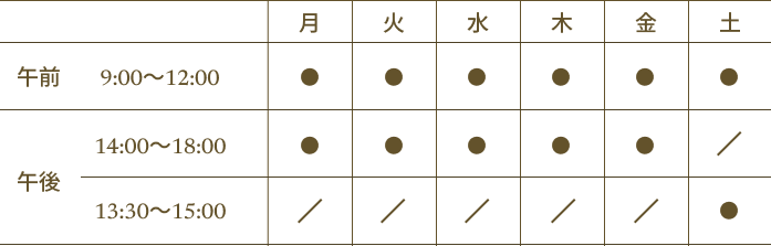 お仕事やご家庭のご都合にも配慮し、平日は18時まで、土曜午後も診療を行っております。